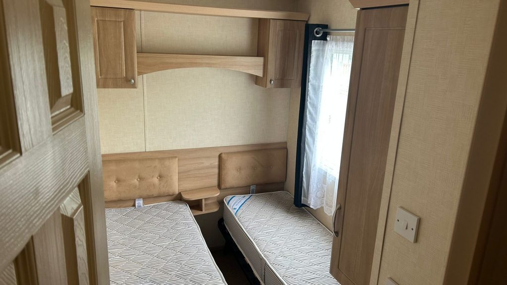 This static caravan features a bright, open-plan living area, a practical kitchen, and three bedrooms, including a master and two twin rooms.