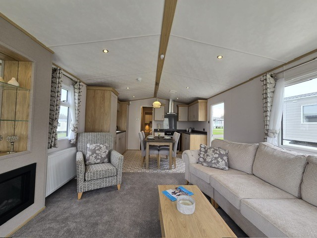 Designed with both relaxation and practicality in mind, the Carnaby Highgrove offers a welcoming retreat all year round. The spacious open‑plan living area features comfortable free‑standing furniture, a stylish fireplace, and large windows that allow natural light to flood the space, creating a bright and airy atmosphere.
