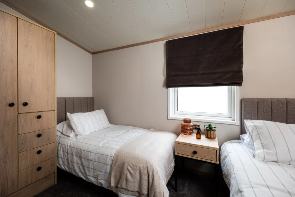 The lodge features a spacious and modern design with 2 comfortable bedrooms, perfect for relaxing getaways.