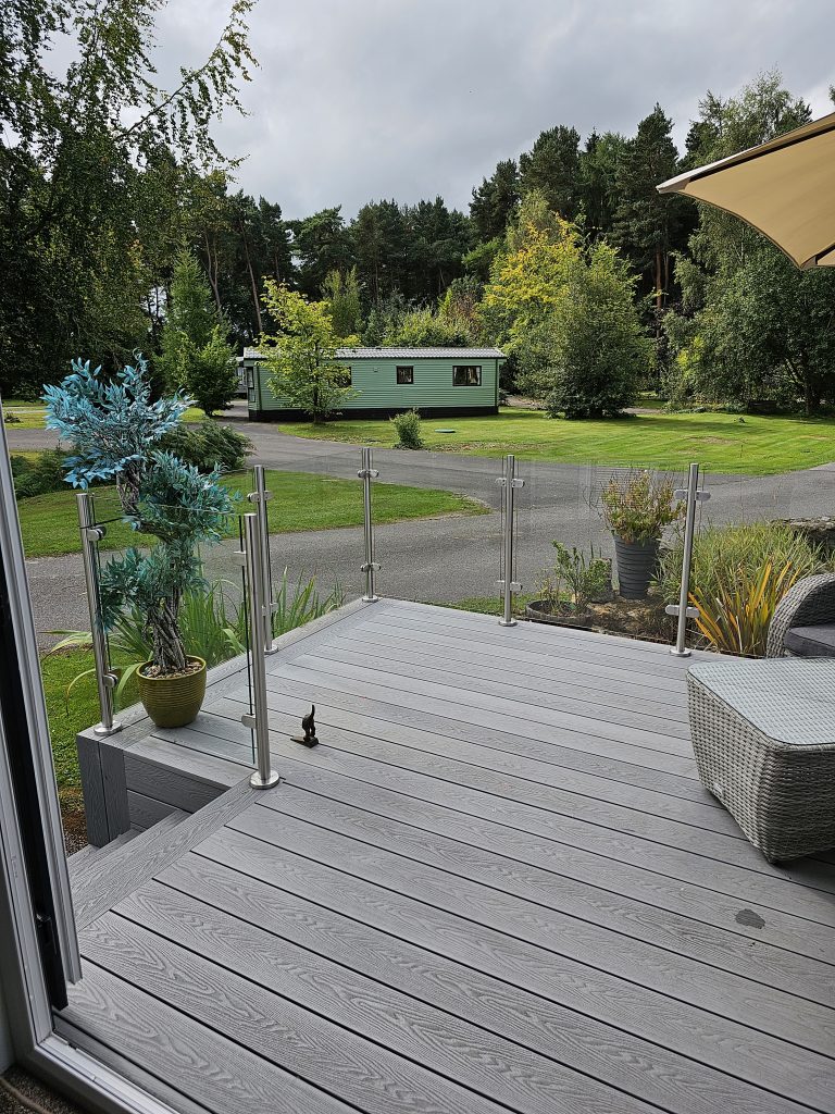 There is a full, maintenance-free composite decking area with glass balustrade and lighting, accessed directly from double patio doors at the front of the lodge.