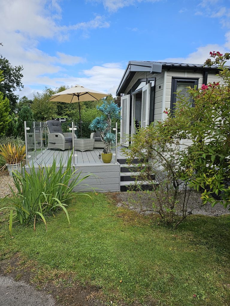 The lodge boasts a maintenance-free composite decking area with a glass balustrade, a private Indian stone patio, and an external shed with electrics.