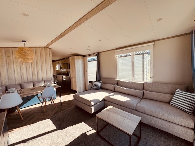 The holiday home features a bright open-plan lounge and kitchen, perfect for socializing, along with two cozy bedrooms for restful nights.
