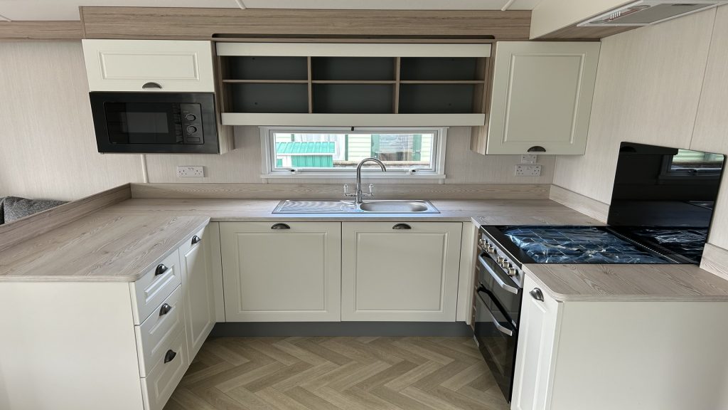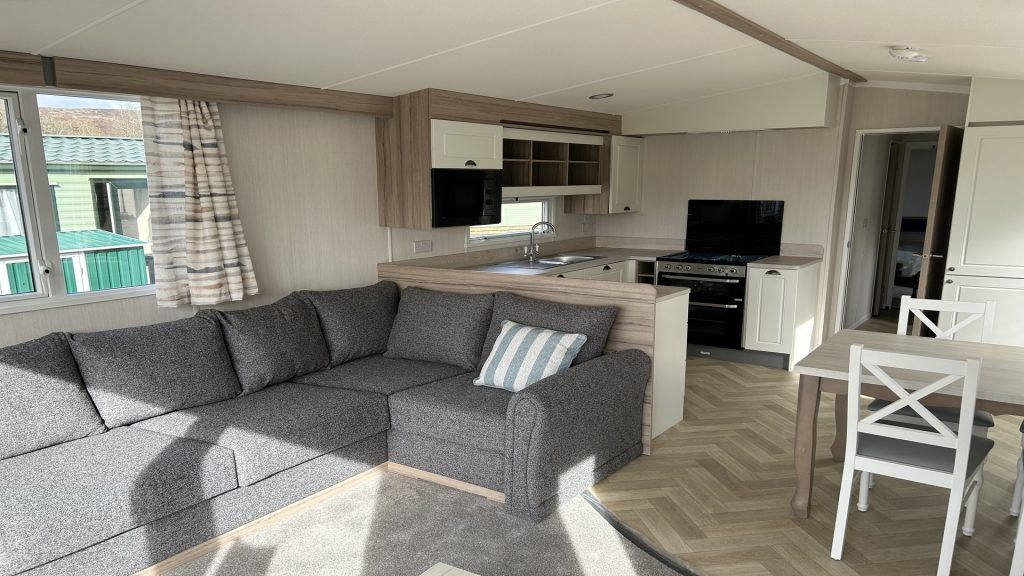A stunning fresh interior scheme underpins this holiday home’s huge appeal offering greater room and an uncluttered environment. In the lounge, a patio door enables expansive views and fills the area with natural light, ideal for sunny afternoons relaxing on the L-shape sofa.